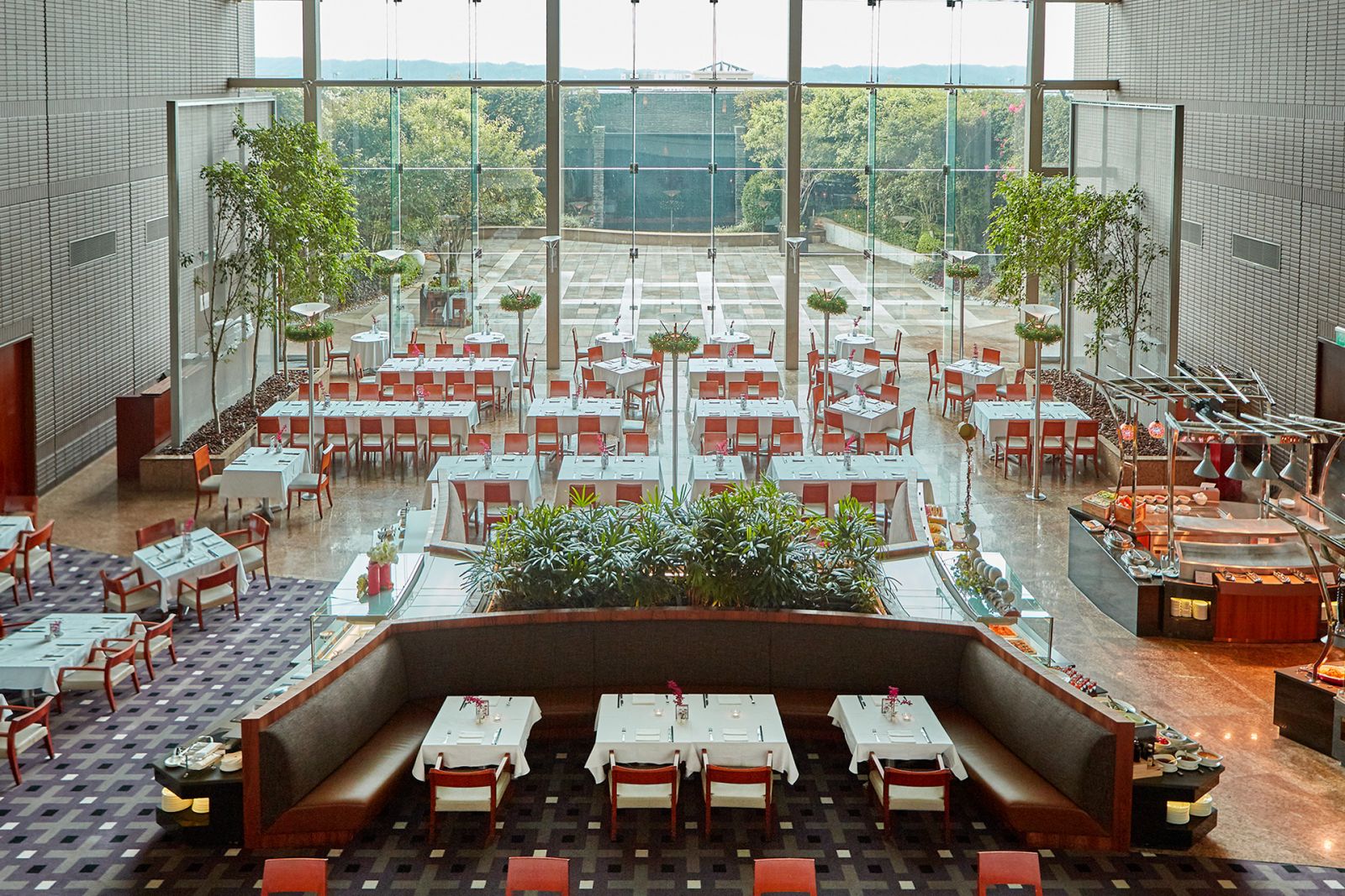 全天候供應餐點的八方燴西餐廳,位於新竹國賓大飯店12樓,擁有挑高3層樓的氣派中庭。挑高玻璃落地窗外為蓊鬱翠綠的空中花園,透過大面落地窗而灑落的自然採光,讓整座餐廳籠罩在和煦的陽光中。