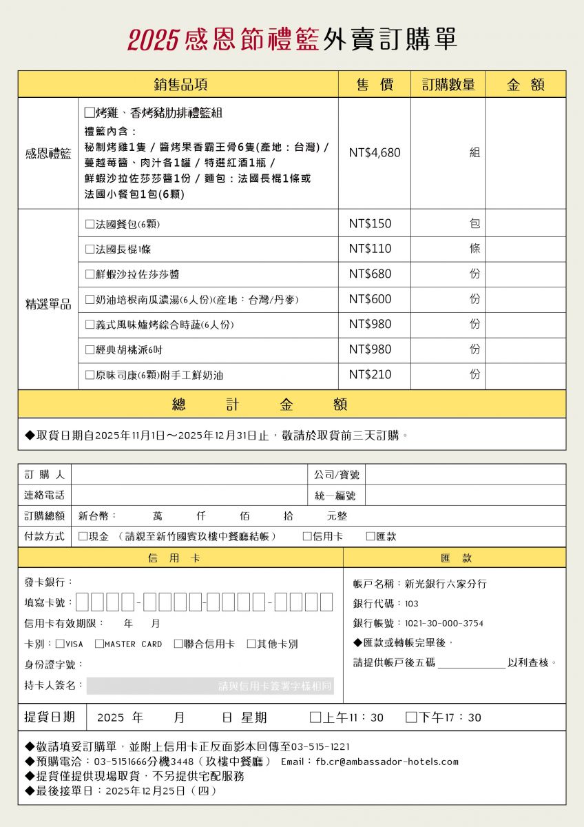 - email洽詢訂購:fb.cr@ambassador-hotels.com