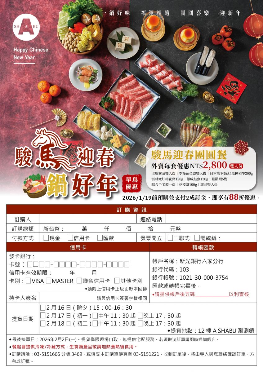 【駿馬迎春團圓套餐】雙人份 優惠2,800元