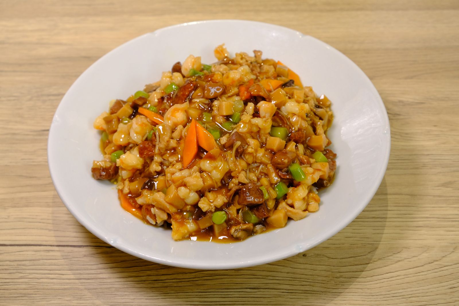 經典粵式濕式炒飯,有別於一般的炒飯呈現。鮑汁、豐富蔬菜丁燴成的香滑勾芡,淋上蛋香且顆粒分明的炒飯上,每一口嚐起來都豐盈及奢華。