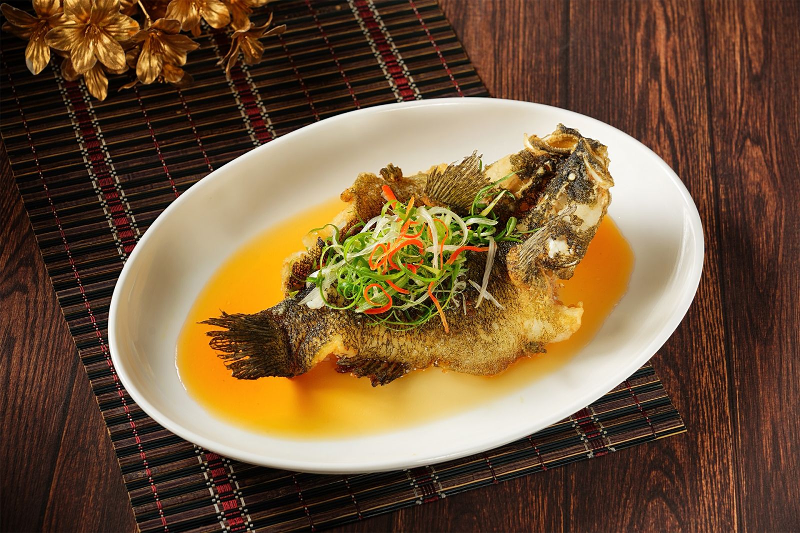 筍殼魚以肉質細緻、刺少聞名,被譽為魚中極品,主廚運用油淋烹調,以精準的油溫控管和酥嫩口感的傳統技法,將外皮炸至酥脆,後淋上特調醬汁,展現出外香脆、內嫩滑的雙重口感,成為一道經典的宴客料理。