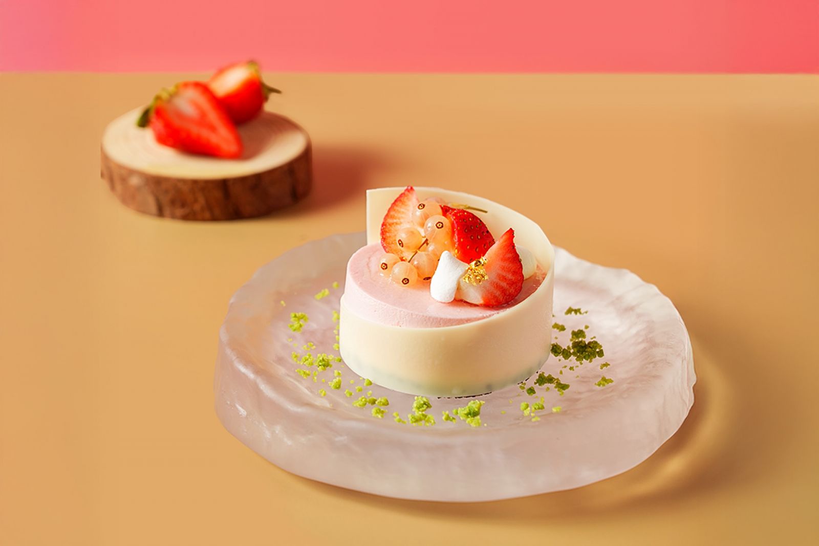 底部以OREO餅乾碎片增加層次,主體為滑順的草莓味慕斯,點綴優雅的馬林糖、白巧克力、新鮮草莓及白醋栗,最後灑上抹茶酥皮菠蘿碎,完成了雲朵般輕盈的法式浪漫。