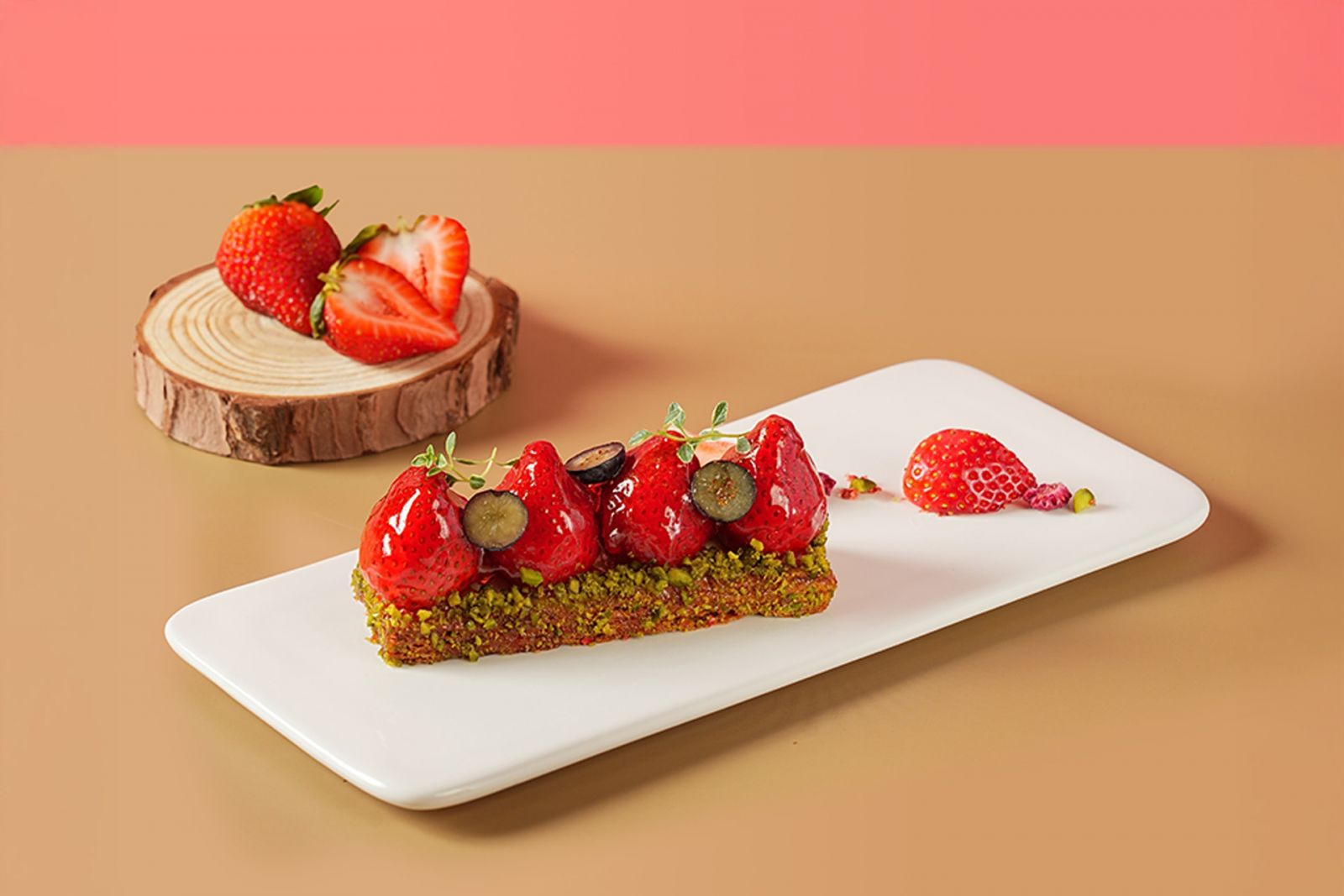 經過烘烤的千層派皮,焦香脆口,填入濃郁卡士達醬酥脆派皮,上方排列了紅亮奪目的新鮮草莓,一口咬下,感受酥皮碎裂的快感及草莓酸甜的果汁,滿分呈現!