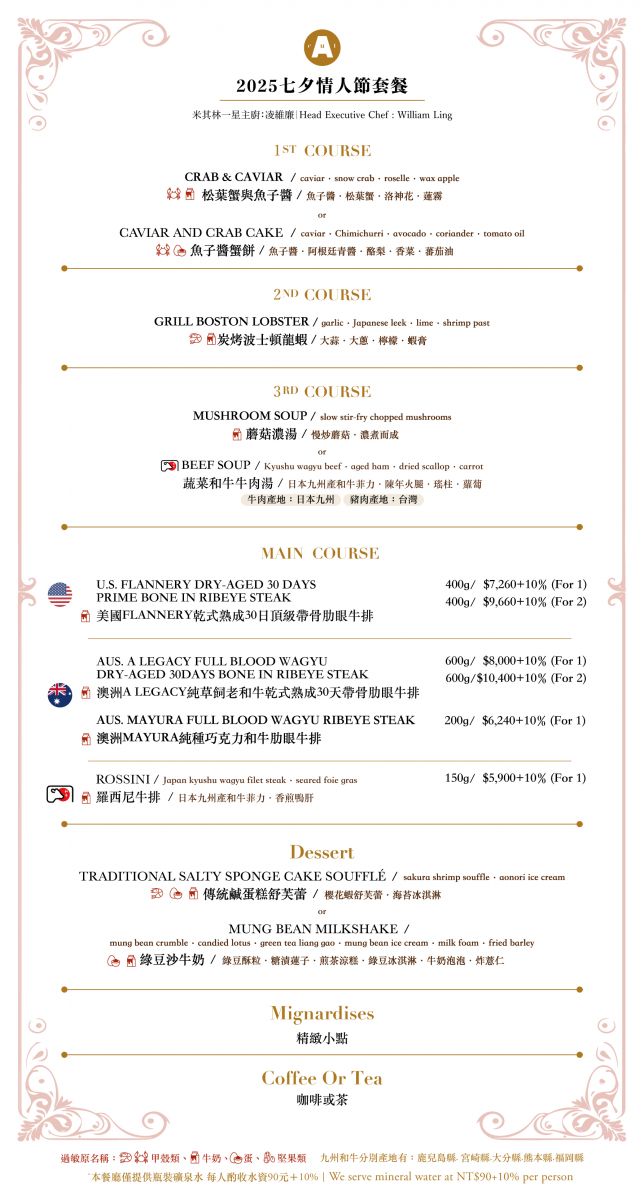 1. 12/24晚餐時段僅提供「聖誕套餐」,菜單為固定菜色,詳細內容請參閱官方網站。如有不吃牛或對菜單有疑慮者,敬請撥電話02-2571-0389洽詢。