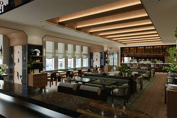 座落於大巨蛋商場 8 樓,設計靈感擷取自體育競技與社交娛樂的交匯點,完美復刻 1920 年代風起雲湧的裝飾藝術美學 。從採用花梨木與琥珀壓花玻璃致敬經典飯店設計的尊榮門面,到結合自然光與淺色木質、營造明亮活力的 78 席開放大廳,處處顯影出新美式風格 。容納24席的包廂以高飽和度的勃根地酒紅與桃花心木為主調 ,強調「私密沙龍的沉浸感」。