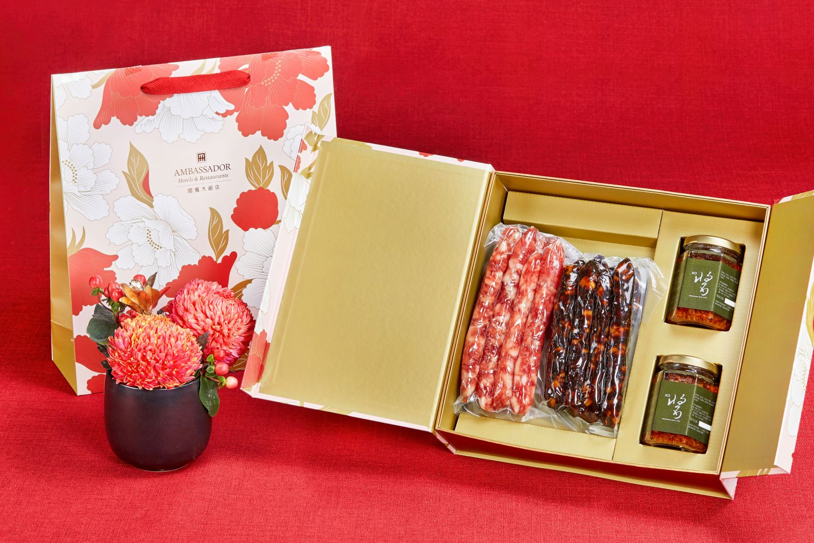 包含二瓶國賓人氣暢銷商品「干貝XO醬」、及春節限定的「肝腸」及「臘腸」。「肝腸」融合瘦肉與肥肉和鴨肝三種食材製作而成,口感細緻軟嫩,加上些許高粱酒,風味獨特;「臘腸」選用豬後腿肉,採瘦肉與肥肉8:2之黃金比例方式製作,加入高粱酒等食材製作,風乾約3-5天,香氣濃郁。