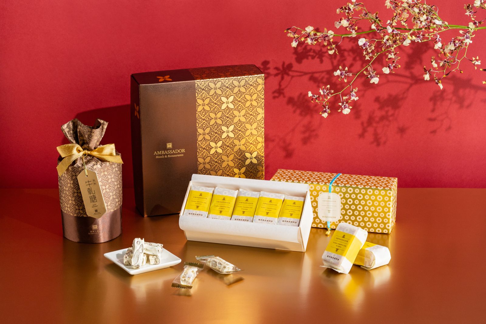「國賓牛軋糖」透過嚴密控制煮糖的溫度與時間,製成軟中帶Q的完美口感,搭配飽滿香脆的杏仁粒和濃郁奶香,讓幸福感在嘴裡滿溢。「國賓經典鳳梨酥」色澤金黃恰似金磚,象徵財富滿載好兆頭,內餡巧妙運用三款不同的鳳梨品種,調和出絕佳的酸甜比例,香酥的餅皮散發著奶香,口感細膩迷人。兩款美味組合,帶有滿滿的祝福滋味,是送禮的絕佳選擇。