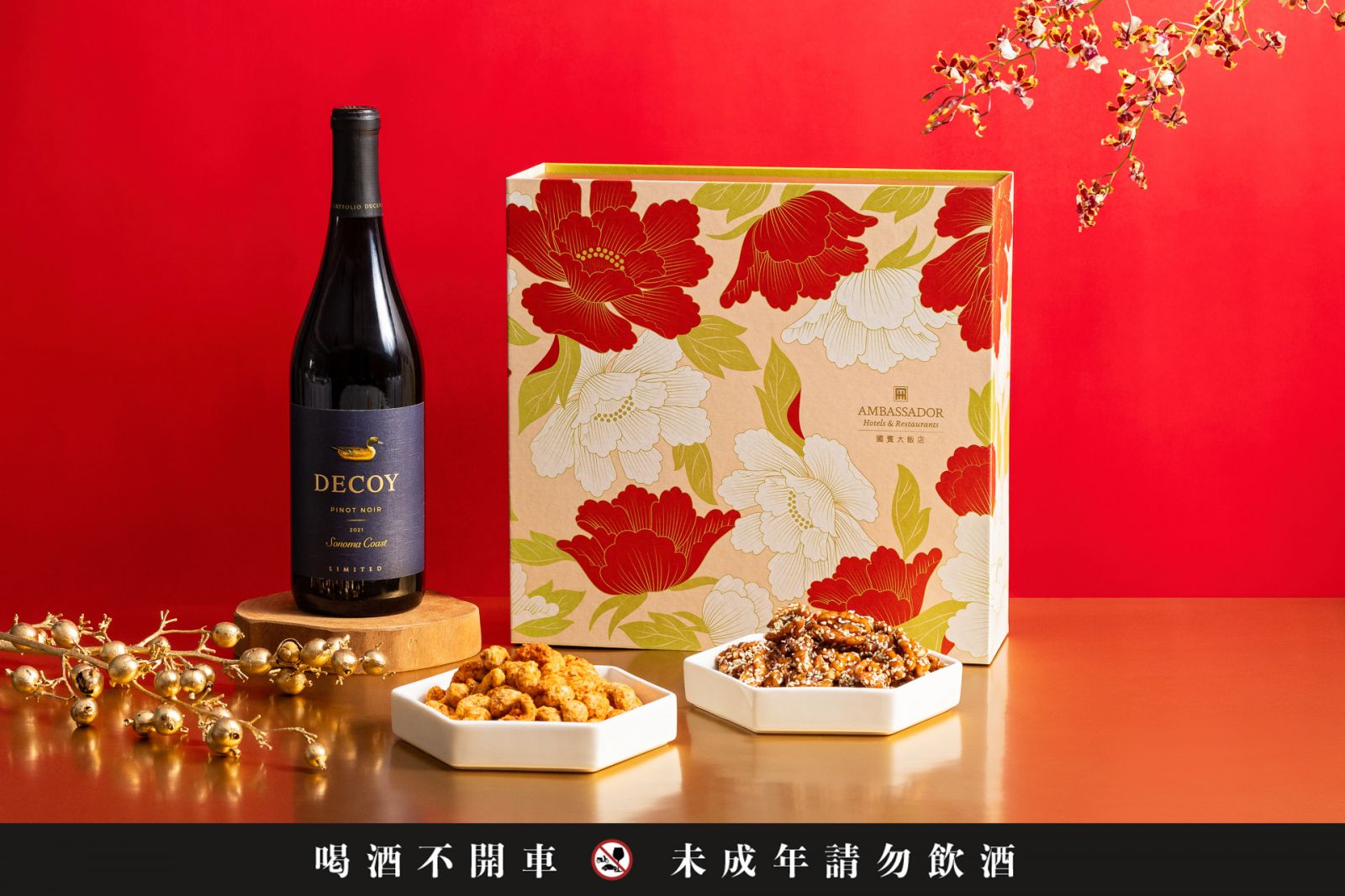 國賓米其林一星A CUT牛排館首席侍酒師嚴選「Decoy黑皮諾紅葡萄酒」,散發出濃郁的紅果香氣,伴隨著淡淡的香料和橡木味,入口柔順,單寧細緻,餘韻悠長,搭配國賓中餐廳行政總主廚林建龍自製2款堅果,不僅展現獨特的品味,更能傳遞滿滿的關心與祝福。「辣味糖霜腰果」選用上等腰果,經過精心烘焙,外層裹上香甜的糖霜,再加入適量的辣椒粉,讓每一顆腰果都充滿了川式獨特風味;「焦糖芝麻核桃」嚴選優質核桃,經過烘焙後,裹上香濃的焦糖,再撒上芝麻,讓每一顆核桃都散發出濃郁的香氣。焦糖的甜味與核桃的香脆完美結合,再加上芝麻的獨特風味,讓口感更加豐富。