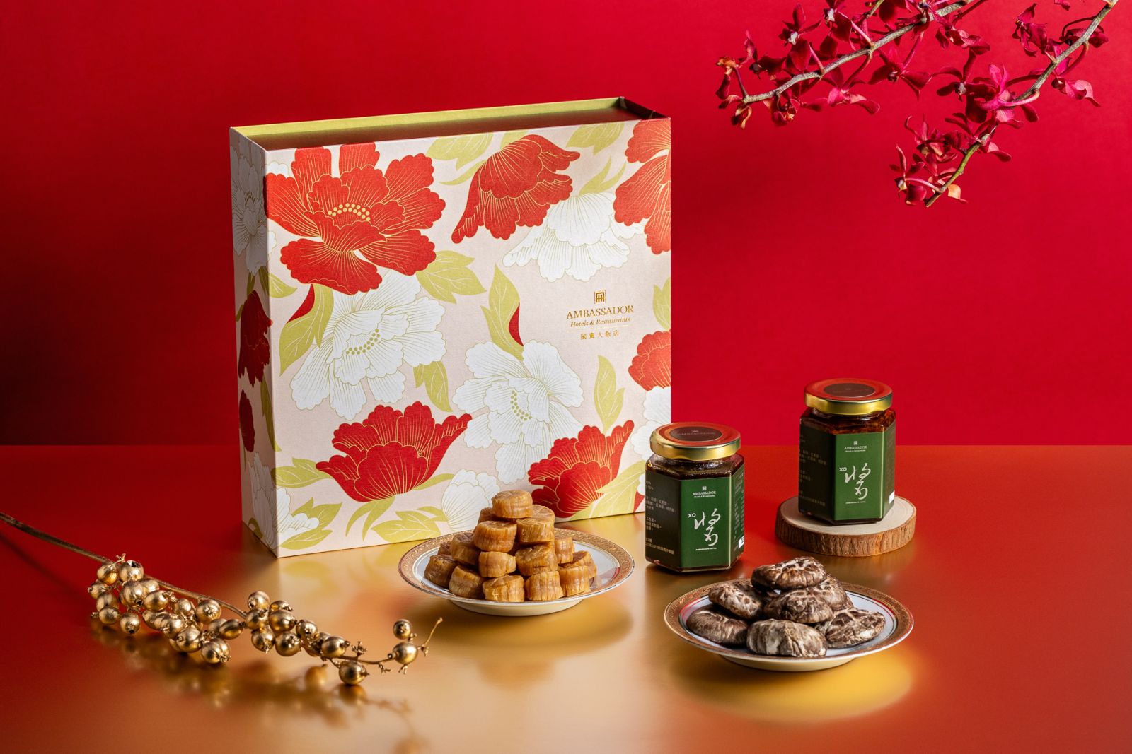 禮盒內容包含國賓人氣商品「干貝XO醬」,搭配象徵富貴吉祥的「花菇」與「干貝」,是年節送禮首選。