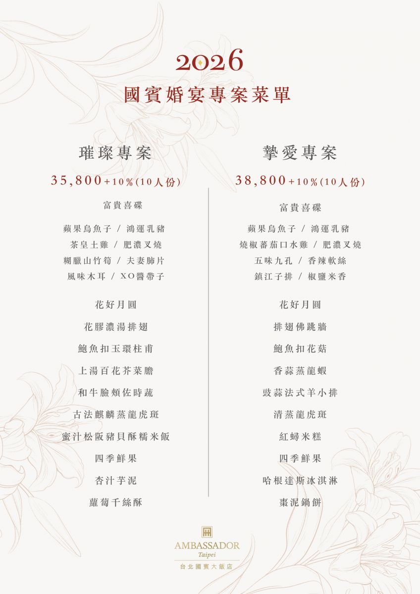 「樓外樓」一直是國賓婚宴熱門場地,以「珠寶盒上的緞帶」為主題,訂製捷克手工Lasvit水晶吊燈,手工一顆顆鑲嵌耗時三個月,錯落有致的光影堆疊,搭配燈光流動更顯浪漫多情,獨立式宴會空間可容納約12桌中式婚宴,並推出專屬婚宴專案供新人選擇,10桌以上加贈婚禮主持。